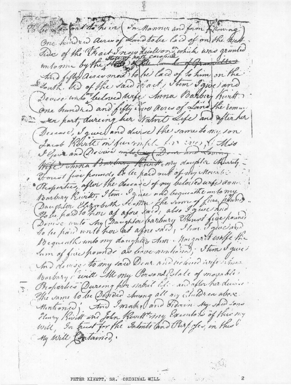 Original Will of Peter Kivett (3 pages) copied most likely from a copy from the North Carolina Archives file folder of "Peter Kivett, Sr. 1794", Randolph County, North Carolina as found in the archives of the Peter Kivett Family Association, Inc. archives, in 1996: